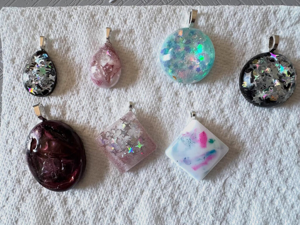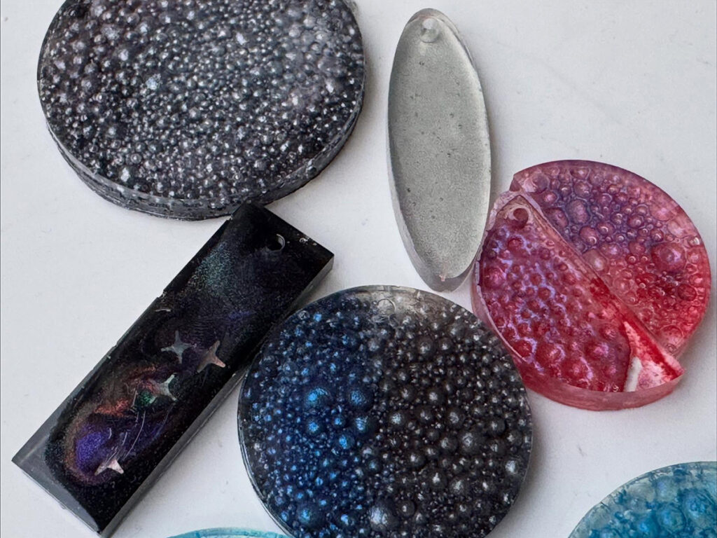 My favorite part about working with UV resin are the endless possibilities of what I can create and the quick reward of seeing the final product. Every time I put on my mask and gloves, and open my mica powders and glitter, I start experimenting with color and shape, ideas and creativity. How the resin may flow or react to different inclusions is always a surprise. I can’t control the resin but rather I guide it and make suggestions. The most exciting part is when I unmold a piece to see the results. Sometimes it is beautiful while other times… a complete and utter failure. But each piece leads me to ask, “What if I…” and try again.